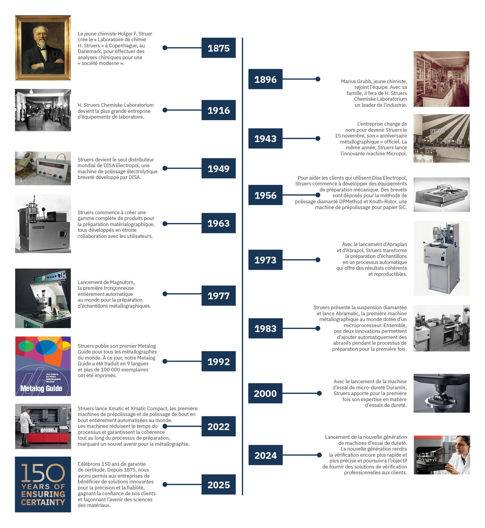 En 1875, Holger F. Struer fonde Struers, après avoir pris conscience du potentiel de l’analyse chimique pour faire avancer la recherche. Cette étincelle d’innovation nous a toujours motivés. Depuis 150 ans, nous offrons à nos clients la fiabilité nécessaire afin d’aider les industries du monde entier à atteindre la précision et le progrès.