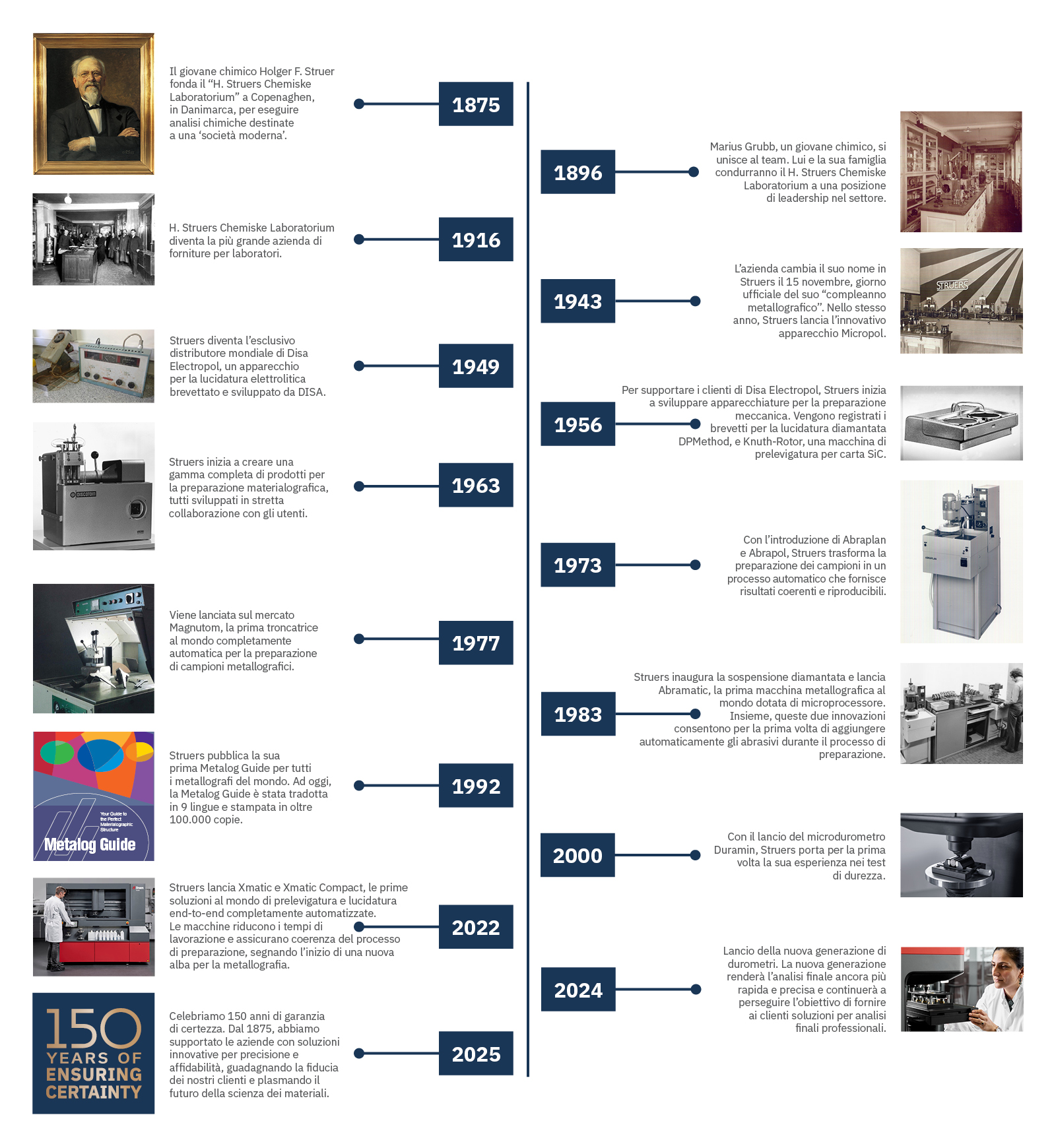 Nel 1875, Holger F. Struer fondò Struers riconoscendo il potenziale dell'analisi chimica per far progredire la ricerca. Quella spinta all'innovazione ci ha guidati sin dall'inizio. Da 150 anni assicuriamo certezze ai nostri clienti per consentire alle industrie di tutto il mondo, di raggiungere livelli massimi di precisione e favorirne il progresso.