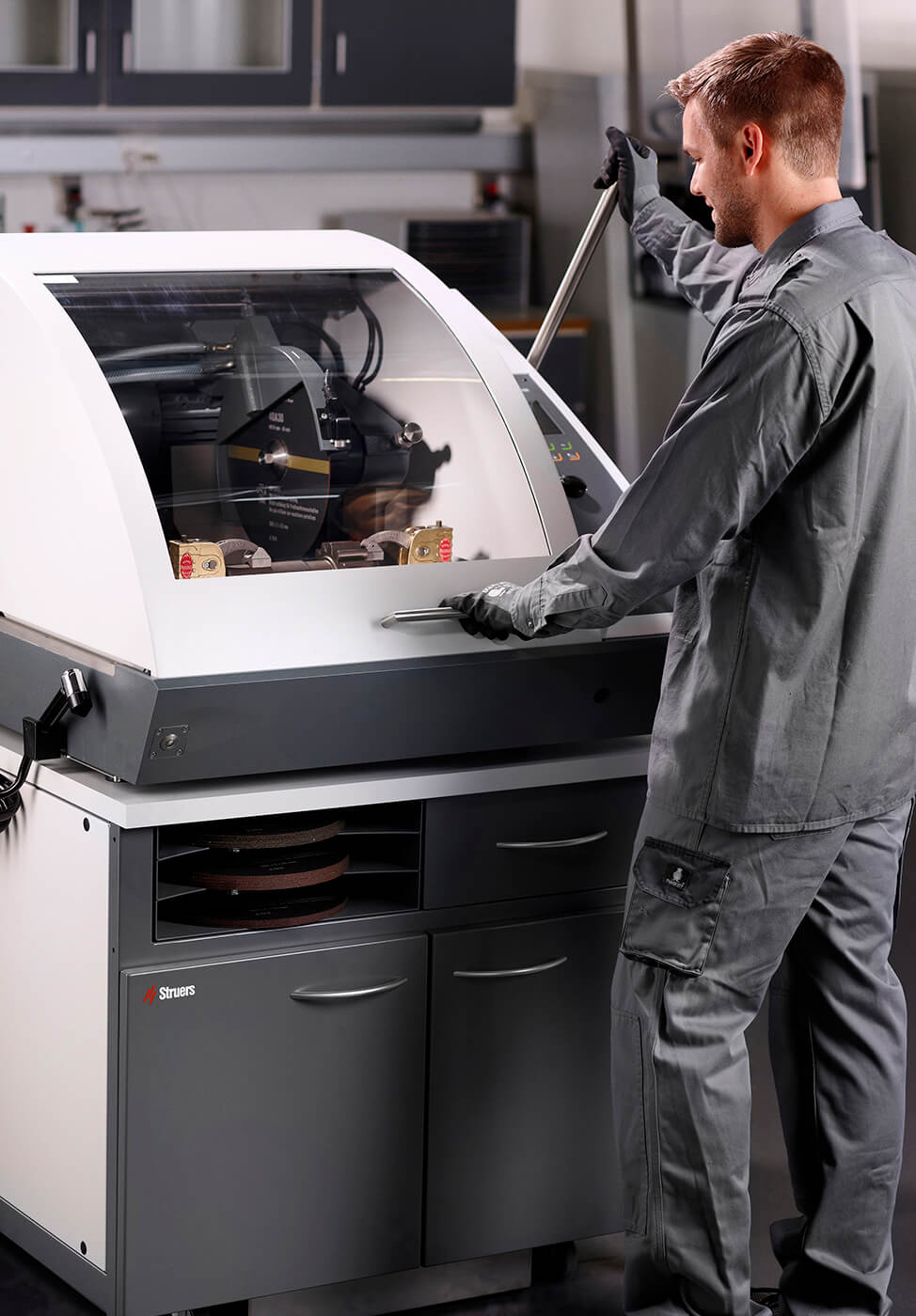 La nuova funzione di sicurezza prevede che anche se il campione non è stato serrato correttamente, la direzione di rotazione della lama assicuri che il campione venga indirizzato verso la tavola di taglio. Il blocco della catena di sicurezza (interblocco e interruttore magnetico) impedisce l'avvio del disco di taglio quando il coperchio è aperto e garantisce che l'operatore non possa aprirlo finché il disco non smette di girare. L'interruttore della catena di sicurezza assicura che per il movimento della tavola X-Y sia necessario utilizzare due mani quando il coperchio è aperto.