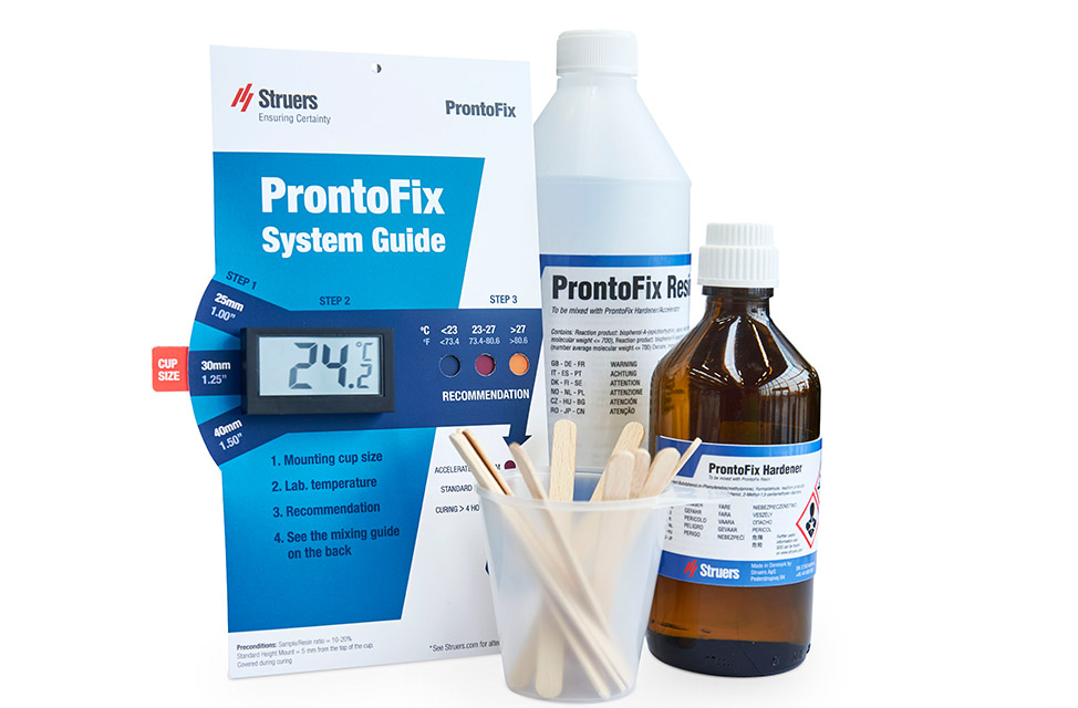 Il sistema comprende una resina e un indurente. Può anche essere combinato con un acceleratore per garantire una polimerizzazione rapida quando si utilizzano piccole tazze di inglobamento a basse temperature. Per sapere se è consigliabile l'acceleratore, forniamo una Guida. guide. Nell'acquisto del Kit ProntoFix è inclusa la Struers System Guide, che rende facile determinare la necessità dell'acceleratore per il lavoro in laboratorio.